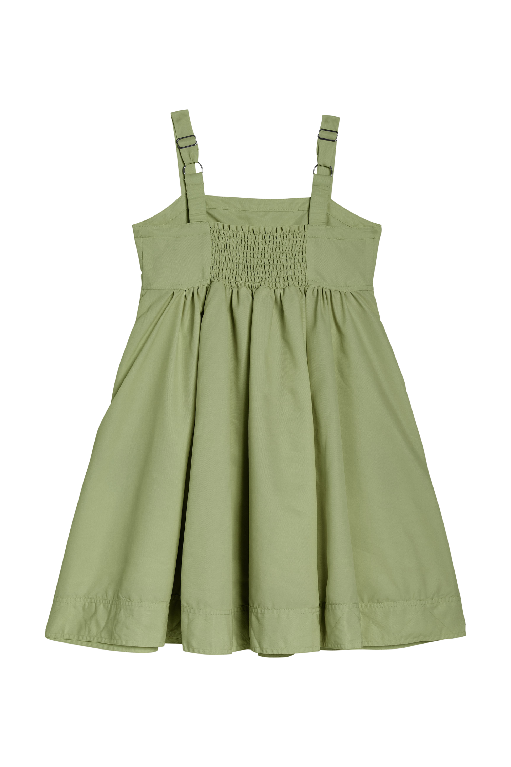 This olive cargo strap dress features a woven fabric with a fitted bodice and a gathered A-line skirt that creates a soft, relaxed shape. Adjustable shoulder straps and oversized cargo pockets add a casual utility-inspired detail while maintaining a clean, playful silhouette.