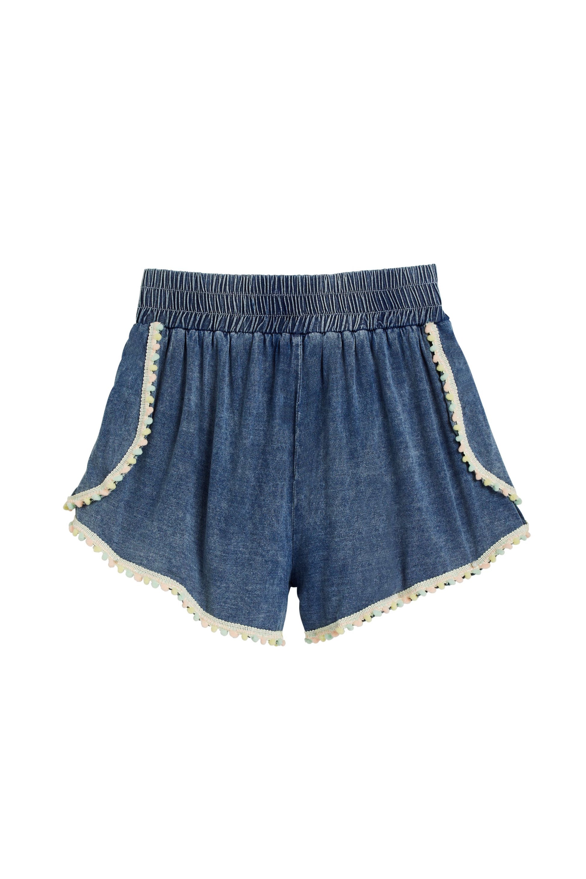 These dolphin shorts bring a playful touch with mini pom-pom trim along the edges. Designed for comfort and style, they feature a relaxed fit and an easy pull-on waistband, making them perfect for everyday adventures.