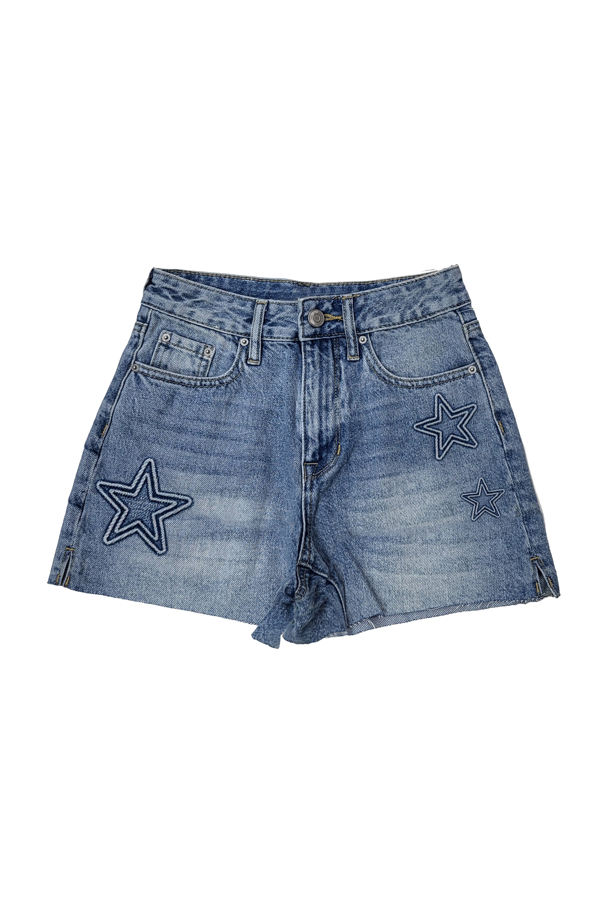 These indigo denim shorts feature a mid-rise classic short silhouette with stitched star detailing across the front. The relaxed leg opening and washed finish give the style a casual, easygoing look while the star design adds a playful element.