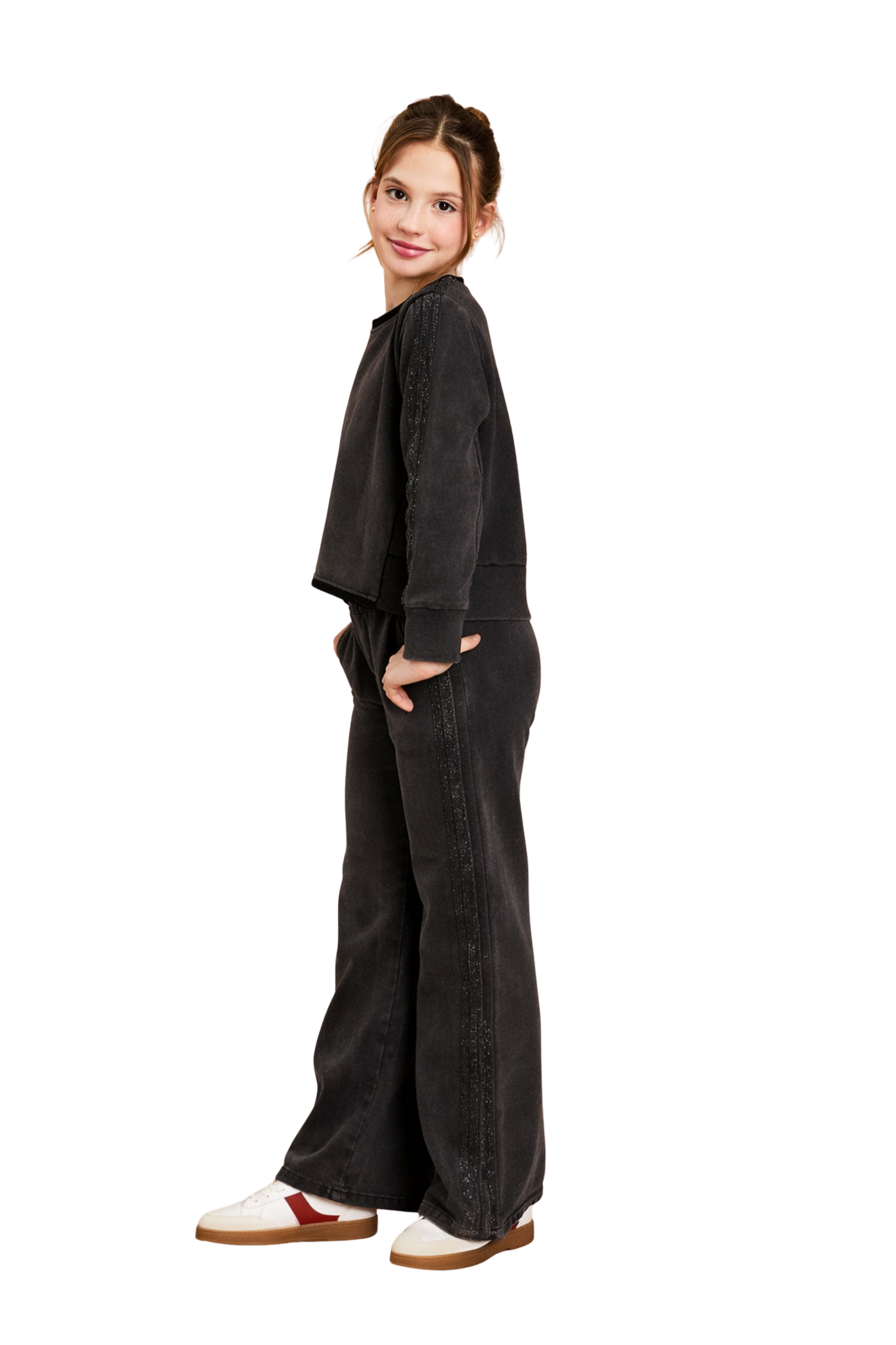 This Grey Wash French terry wide pants are designed with rhinestone stripe accents and a comfortable, laid-back silhouette.