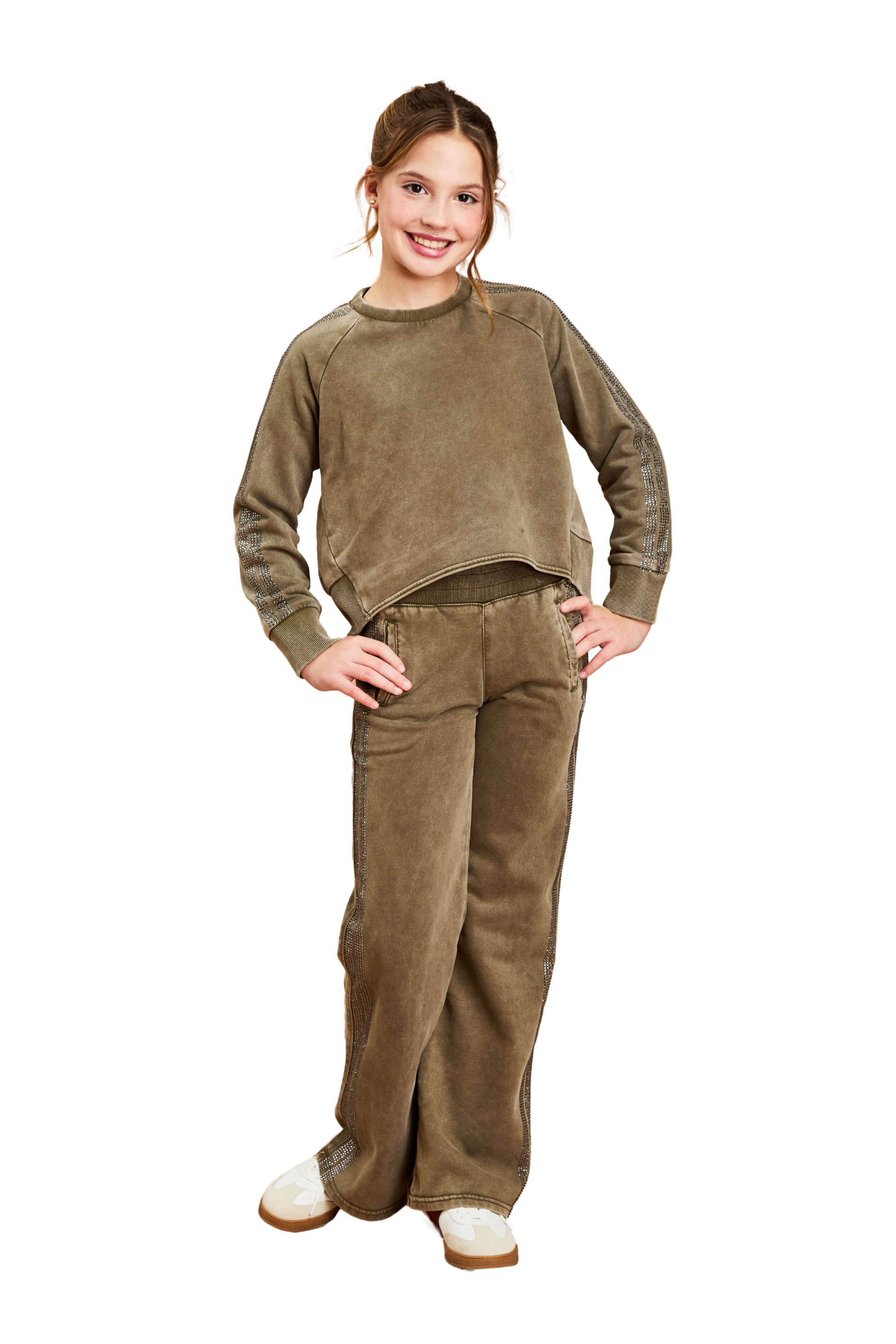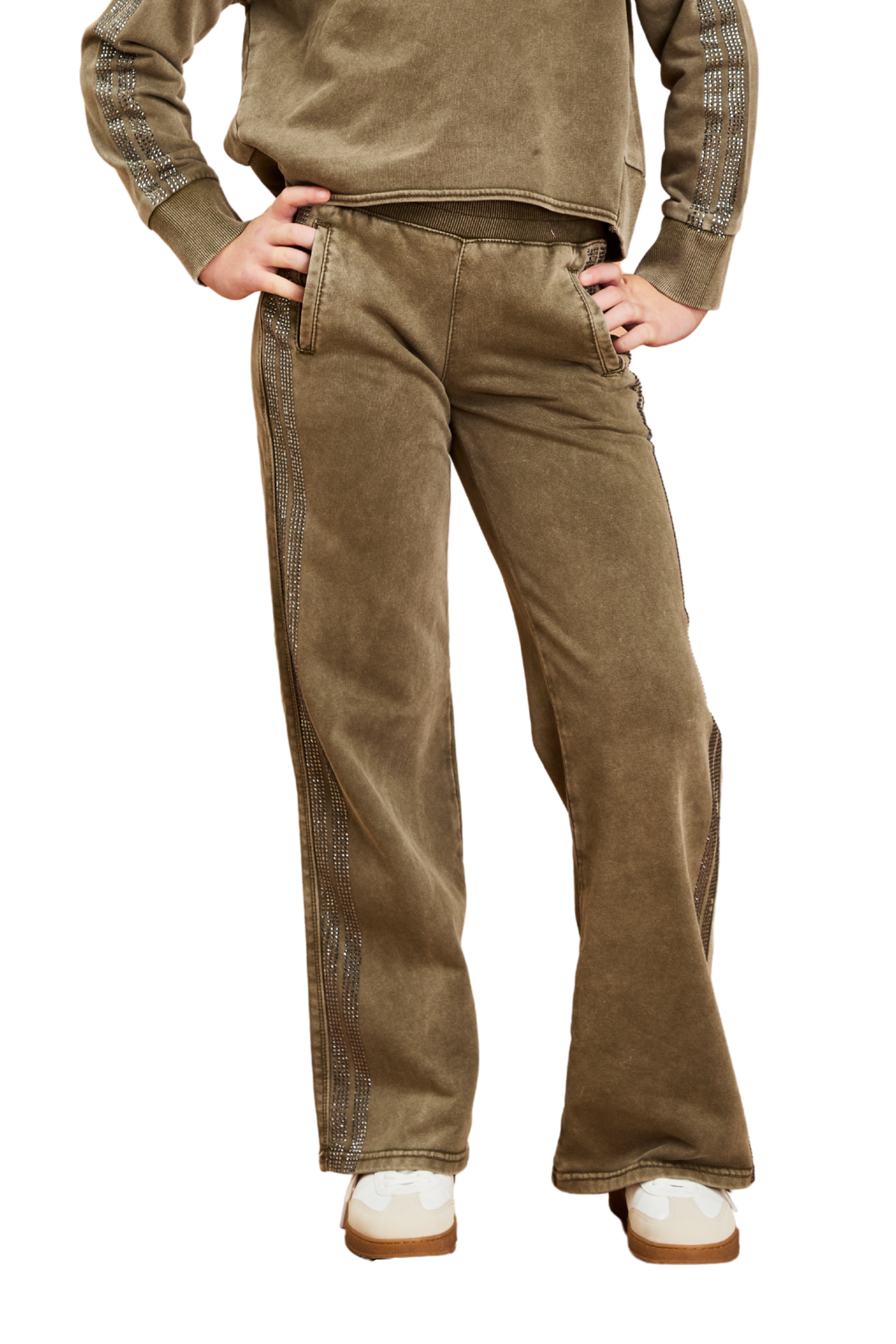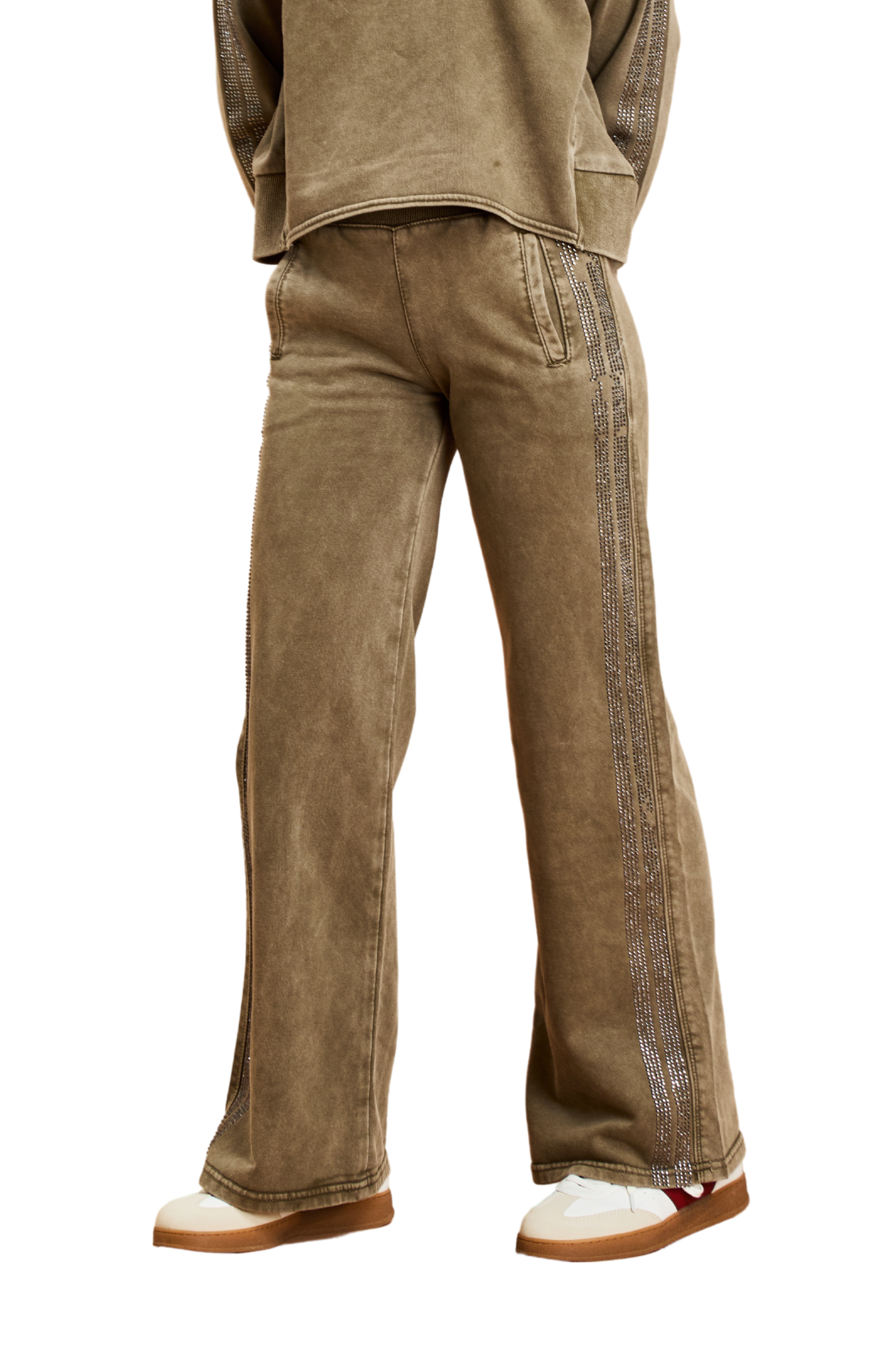 Olive Rhinestone Stripe French Terry Wide Pants with a soft feel and relaxed fit for everyday wear.